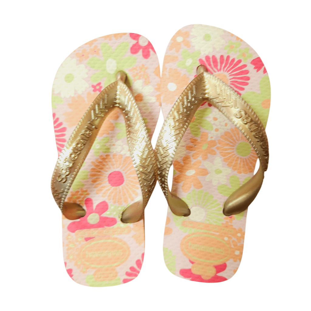 O chinelo Havaianas REF Kids Flores é a escolha perfeita para as crianças que adoram um toque de cor e diversão no visual. Com uma estampa delicada de flores douradas, este modelo une a tradicional qualidade Havaianas com um design alegre e moderno.