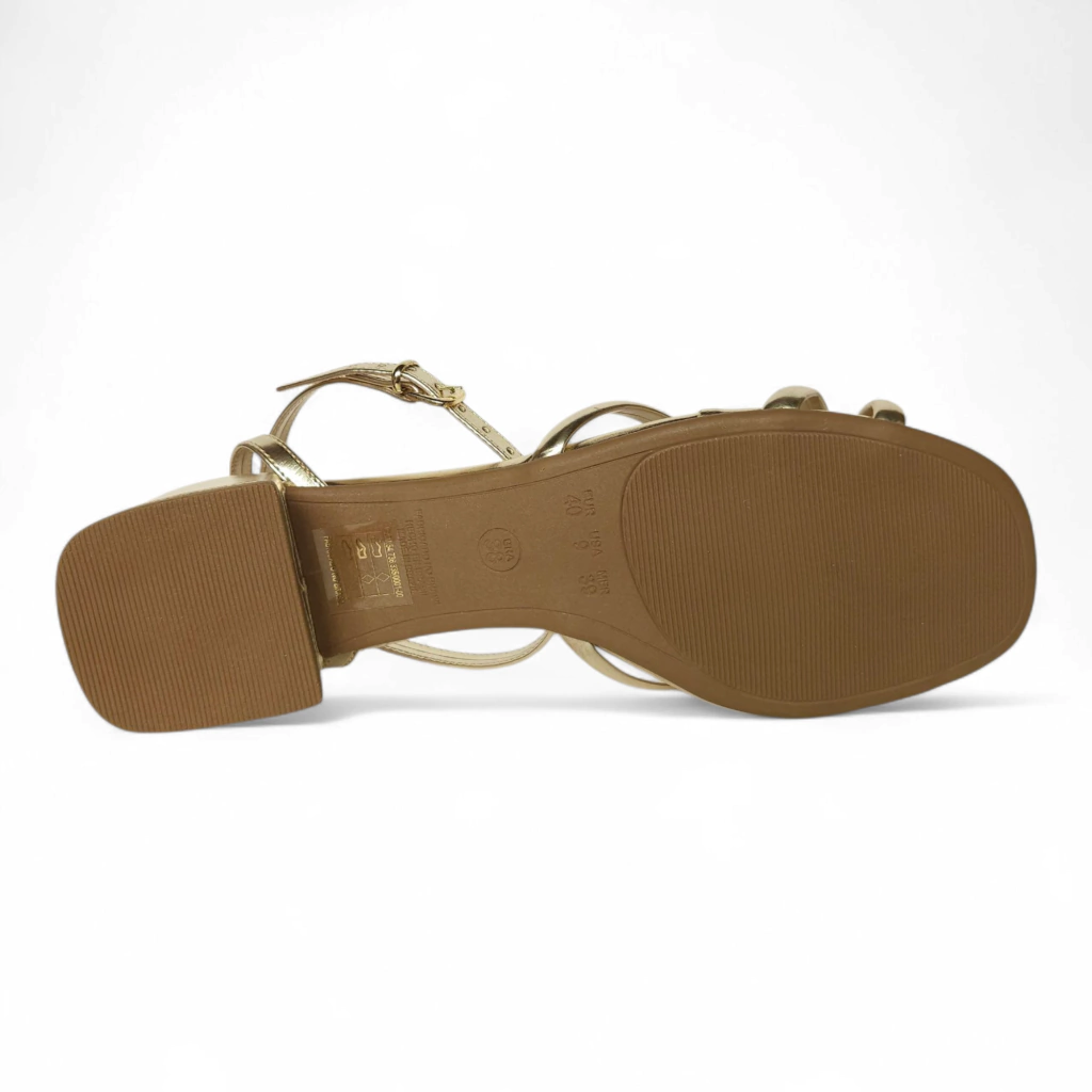 O acabamento dourado traz um toque de brilho elegante, perfeito para complementar looks sociais. Seu salto bloco não só valoriza a silhueta, como também facilita o caminhar em diferentes tipos de superfície, tornando a sandália versátil para várias ocasiões.