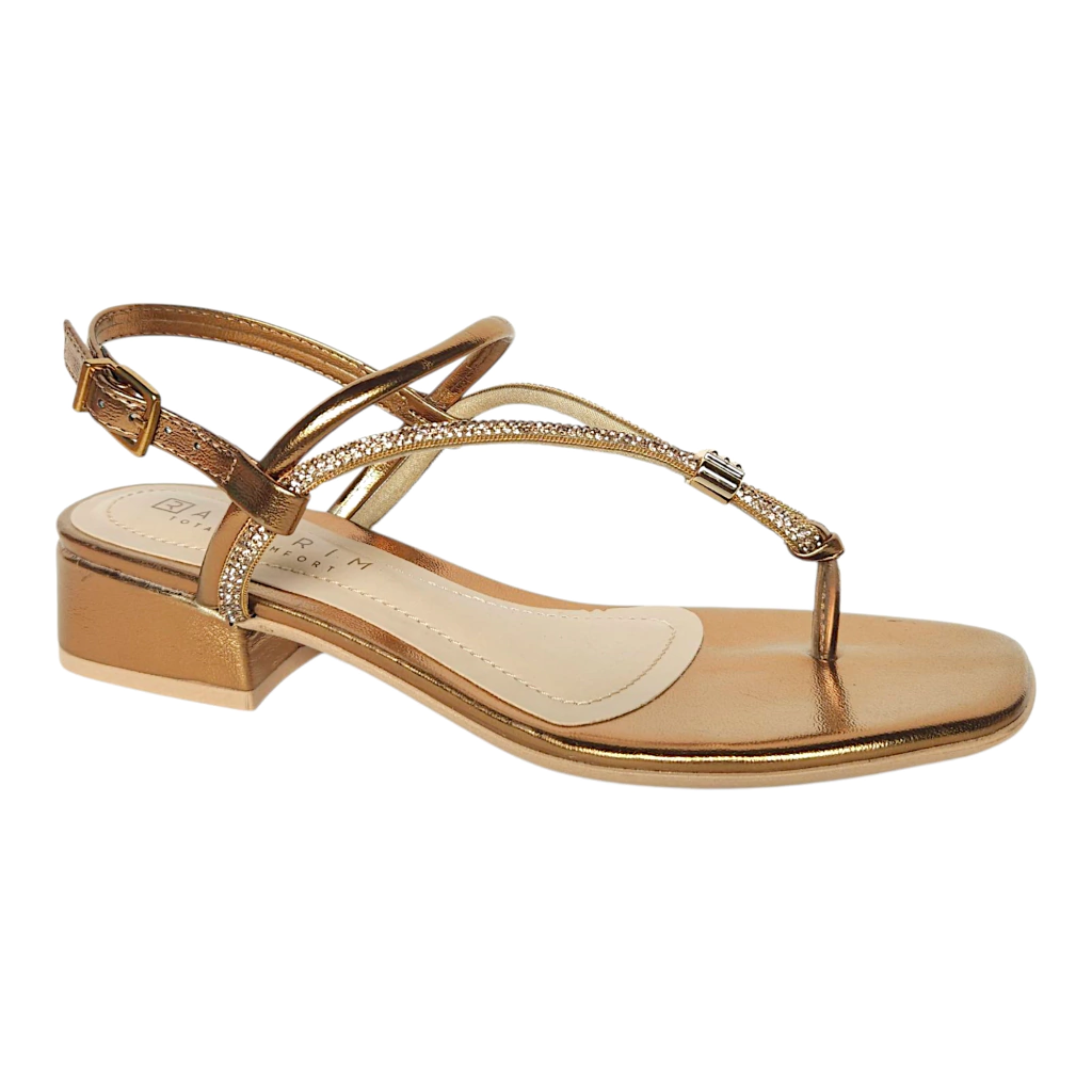 Um dos grandes diferenciais desta sandália está no delicado detalhe em strass no dedo, que traz um toque de brilho sutil e charme, tornando o visual ainda mais refinado. Além disso, o acabamento bronze confere um ar contemporâneo e versátil, possibilitando combinações com roupas formais e casuais.