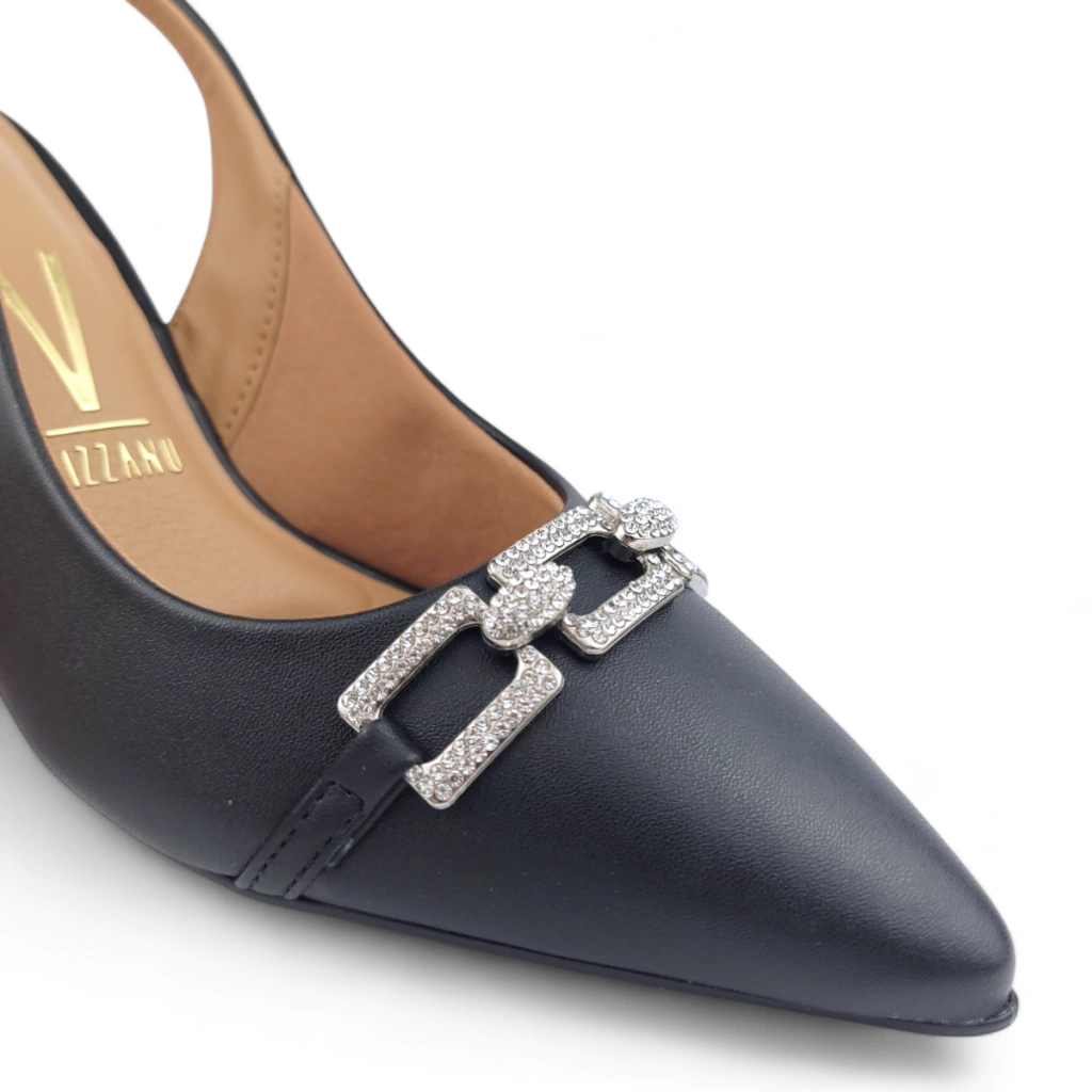 Este scarpin traz um bico fino que alonga os pés, conferindo modernidade e charme ao visual. O toque especial fica por conta do detalhe em strass que adiciona brilho e glamour, tornando-o ideal para eventos sociais, festas ou para quem deseja um look mais refinado no dia a dia.